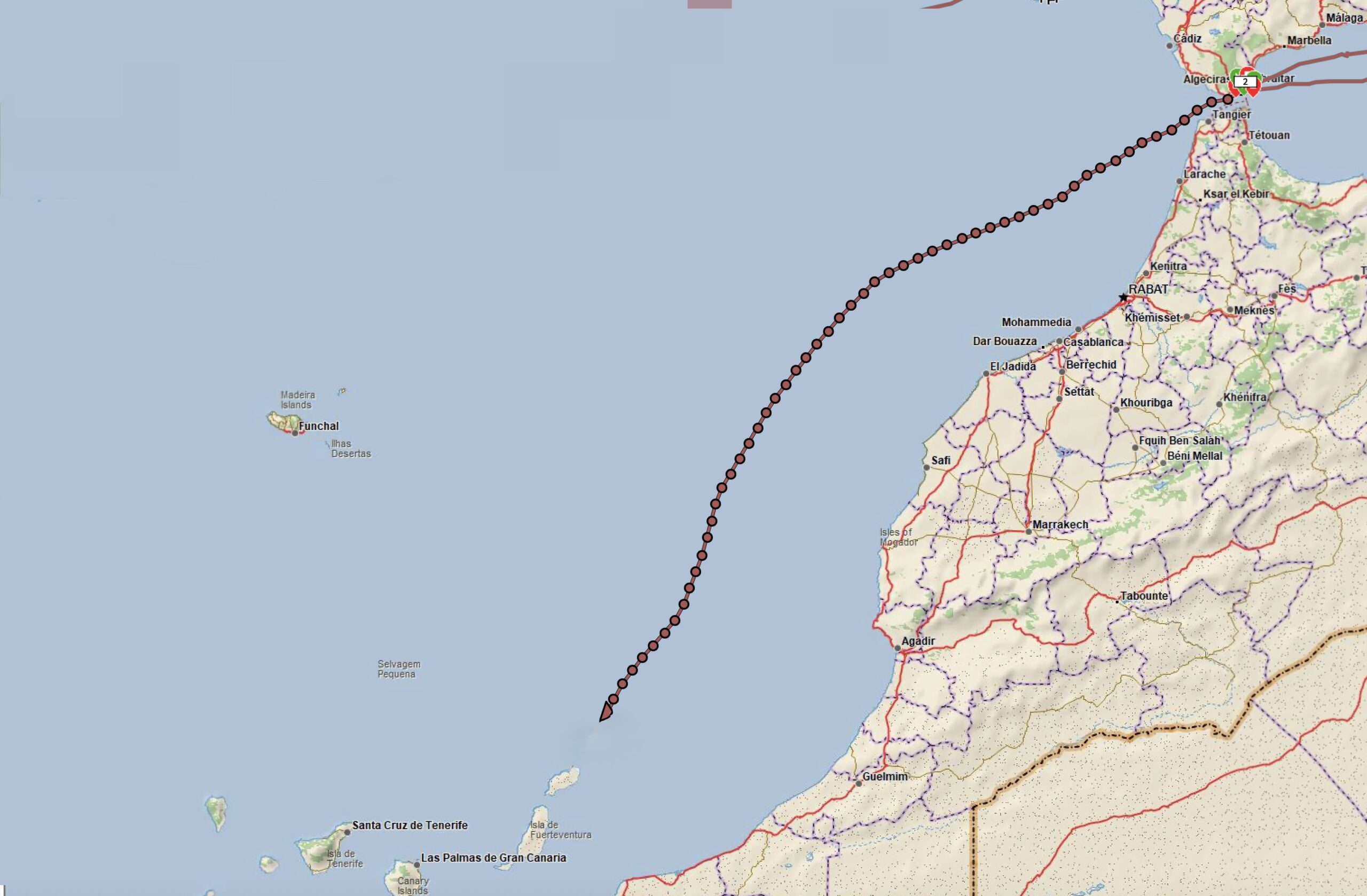 3.) Peer Kunz und Thomas Gräber hatten mit einem 13m Stahlschiff ebenfalls die schwierige Route von den Kanaren zum spanischen Festland vor sich. Sie sind gestern sicher in Cadiz eingelaufen, nachdem Ausläufer eines Atlantiktiefs über sie hinweggefegt waren.